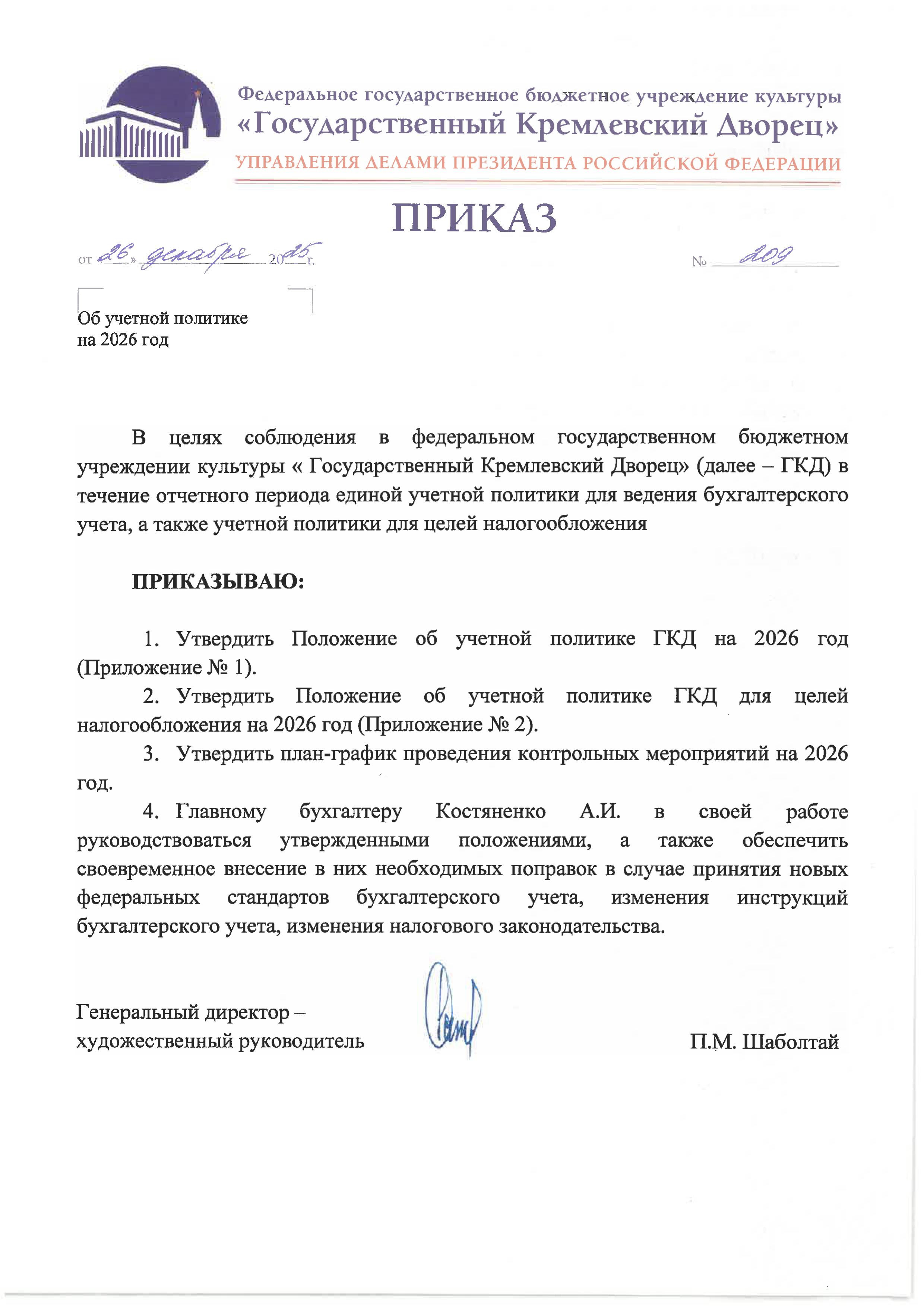 Приказ "Об учётной политике на 2026 год" от 26.12.2025 № 209